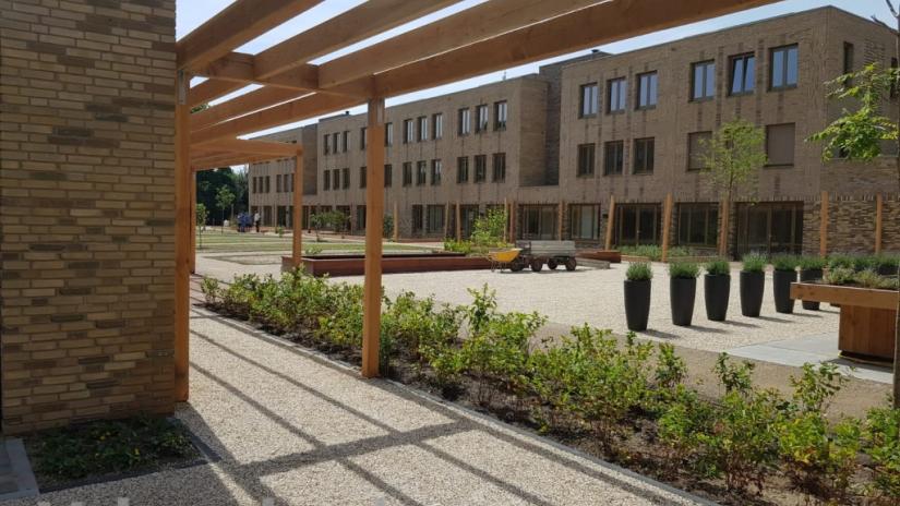 De zorginstelling van vroeger is getransformeerd tot een aantrekkelijke woonwijk. "Drie losse gebouwen, gesitueerd om een tuin als een soort hof," omschrijft Van Veen de nieuwbouw. "En in die gebouwen organiseren we de woongroepen eigenlijk als een grote eengezinswoning, maar dan met acht slaapkamers. Beneden wonen, boven slapen. Je komt binnen in de hal waar je doorloopt naar de keuken en woonkamer met serre. Er wordt in de keuken dagelijks gekookt en waar mogelijk draaien de bewoners mee in het huishouden."