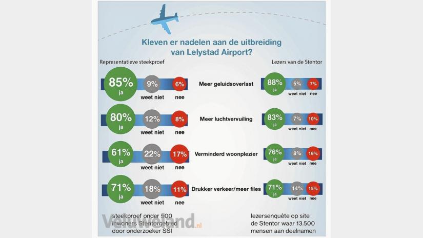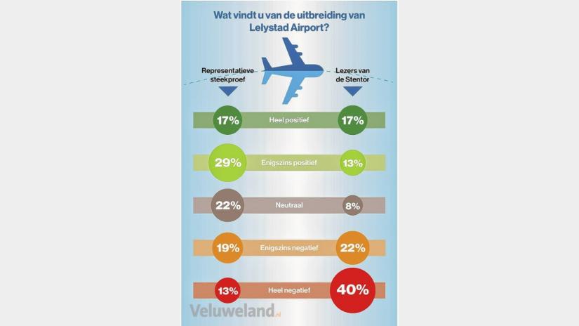 VELUWE Uit een representatieve steekproef onder ruim vijfhonderd inwoners in het verspreidingsgebied van de Stentor blijkt volgens het dagblad dat 46 procent van de mensen uitbreiding van Lelystad Airport toejuicht. Uit een parallel gehouden enquête waar 13.500 Stentorlezers aan meededen, is het draagvlak met 30 procent een stuk kleiner.