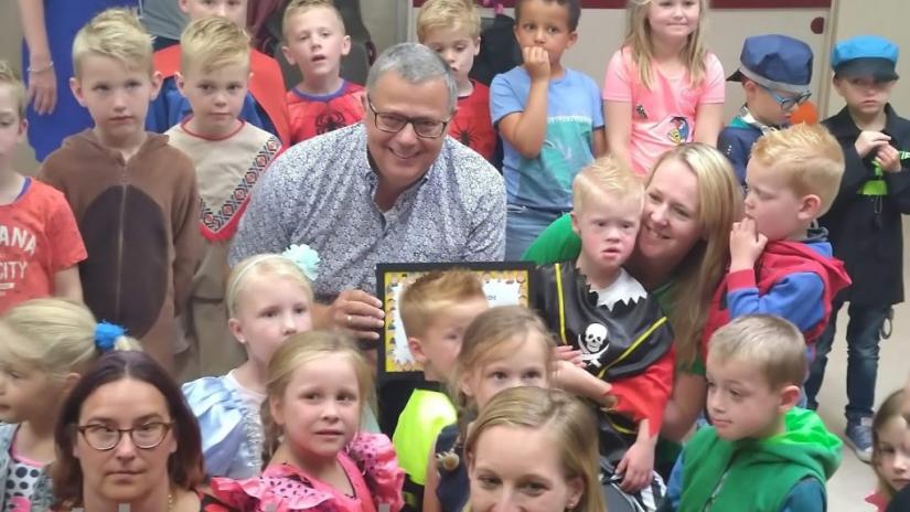 Met het uitreiken van de Passend Onderwijs Pluim willen de ouders van Joas de school bedanken voor hun inzet. ,,Het voelt fijn om deze prijs uit te mogen reiken. Omdat ik zelf ook op deze school heb gezeten voelt het als thuiskomen. En zolang Joas hier een gelukkige leerling blijft, zullen wij er voor gaan."